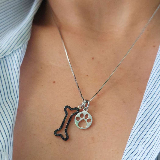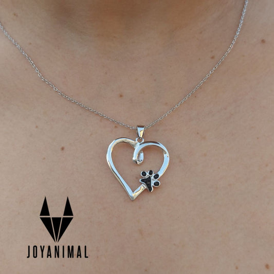 Collar de plata con huella negra de perro o gato dentro de corazón.