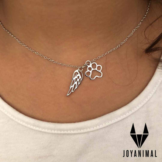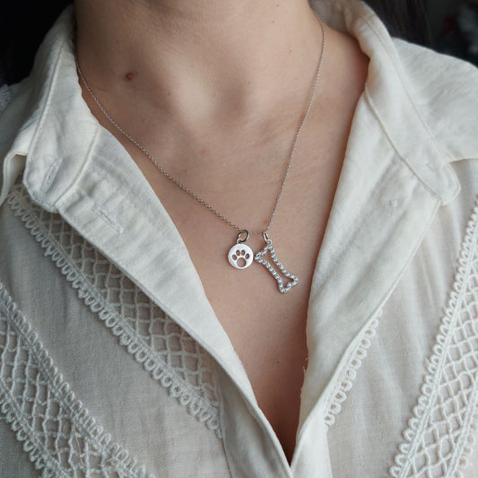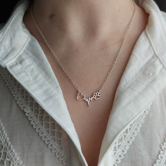 Collar con huella de perro o gato, corazón y latidos de plata.