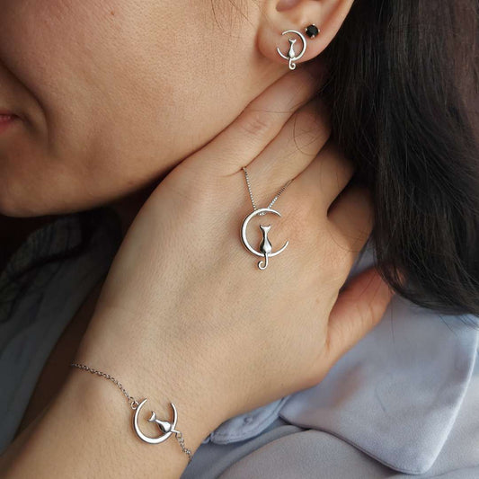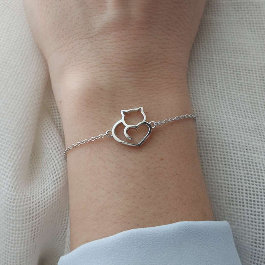 Collar, pulsera y pendientes con gato y corazón de plata.