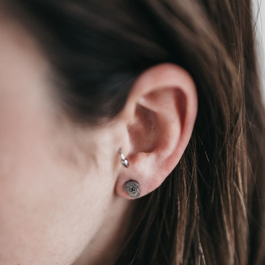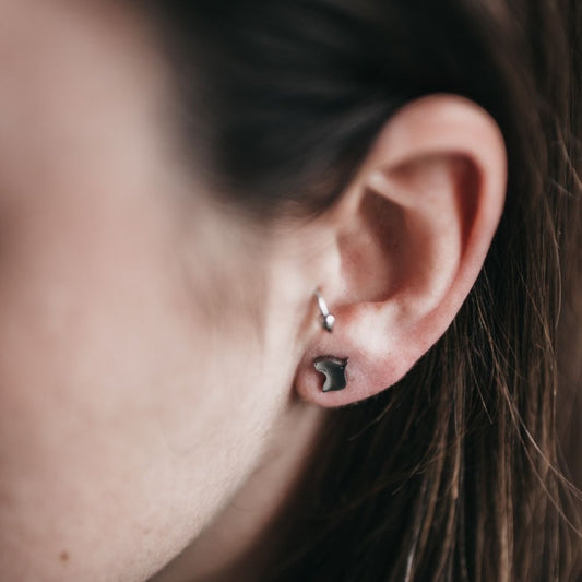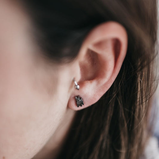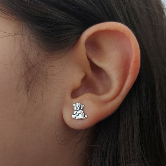 Pendientes pequeños con forma de perritos de plata.