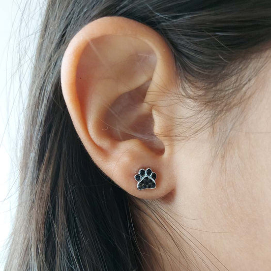 Pendientes de huellas negras de perro o gato, de plata con zirconias.